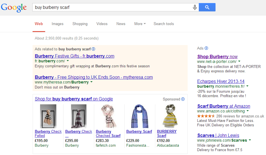 In contrast to the luxury brands’ level of activity in Search Engine Marketing, it can be identified that there are several competitors, ranging from retailers to online portals, already active on search engine results page (SERP) as shown in the example for the search query ‘buy burberry scarf”. SERP is an important touch point for a brand. Thus, it is vital for brands to react and adapt quickly to this radically changing marketplace.