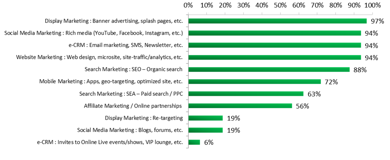 Unsurprisingly, for digital luxury marketing, the results clearly illustrate that 97% of the luxury brands in this research were active in Display marketing while 94% of the luxury brands are active in Social Media Marketing, e-CRM and Website marketing. In regards to Search Engine Marketing, 88% of the luxury brands were active on SEO (organic search) while only 63% of the luxury brands were active on SEA (paid search).