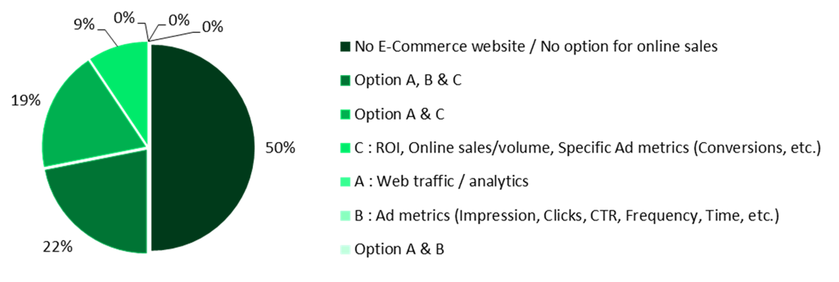 It is found that 50% of luxury brands do not have an e-commerce website. Only 22% of the luxury brands are effectively driving and managing e-commerce sales as they are actively measuring web traffic & analytics, ad metrics and sales volume. 19% of the luxury brands are assessing web traffic & analytics and sales volume while 9% of the luxury brands are only quantifying web traffic & analytics without ad metrics. This 28% of the luxury brands who have not included ad metrics for e-commerce management is a result of not having digital advertising for e-commerce-driven campaigns and/or not having integrated these ad metrics with the other parameters appropriately. This lack of integration should be a significant concern for these brands as it indicates that effective ROI exercises and optimizations are not in place.