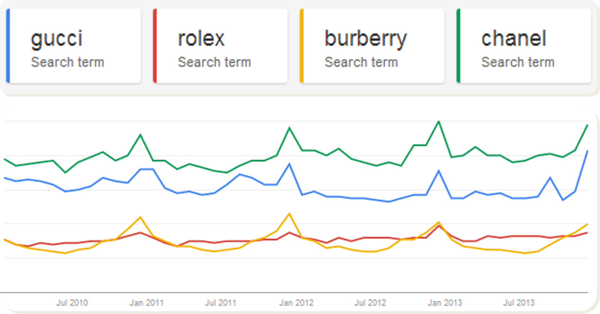 Google Trends tool briefly illustrates the rise in users’ interest towards luxury brands on the search engine over the last 4 years (as shown below).